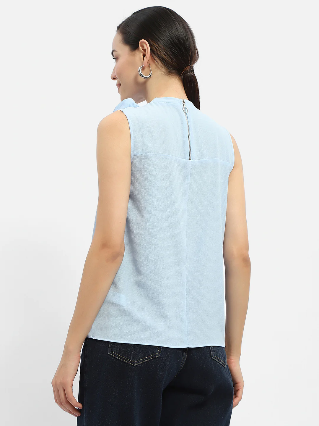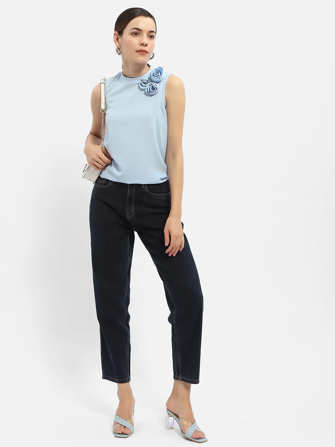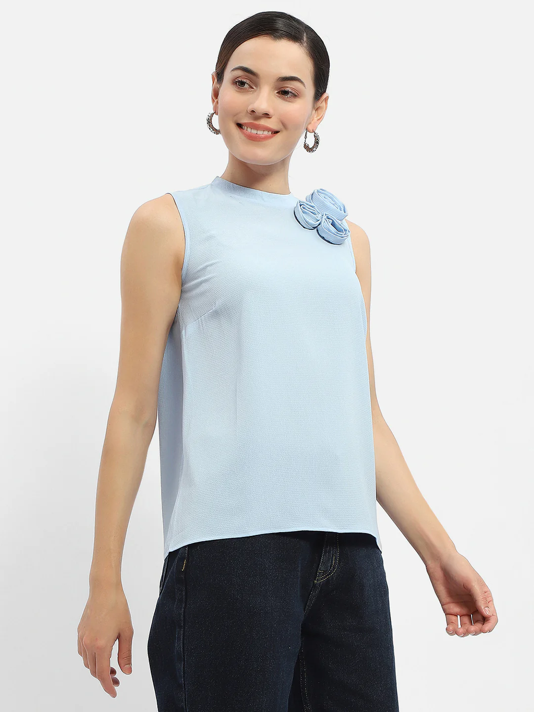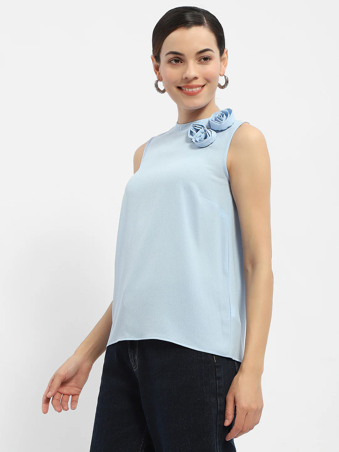Make a statement at any special occasion with this appliqué adorned blue shimmer top. Crafted with meticulous attention to detail, it radiates sophistication and glamour. The exquisite appliqué embroidery on the sleeves and collar adds dimension and texture, giving your outfit a refined and elegant touch. Perfect for evening events, this top pairs beautifully with tailored pants or skirts to complete a polished and stylish ensemble.