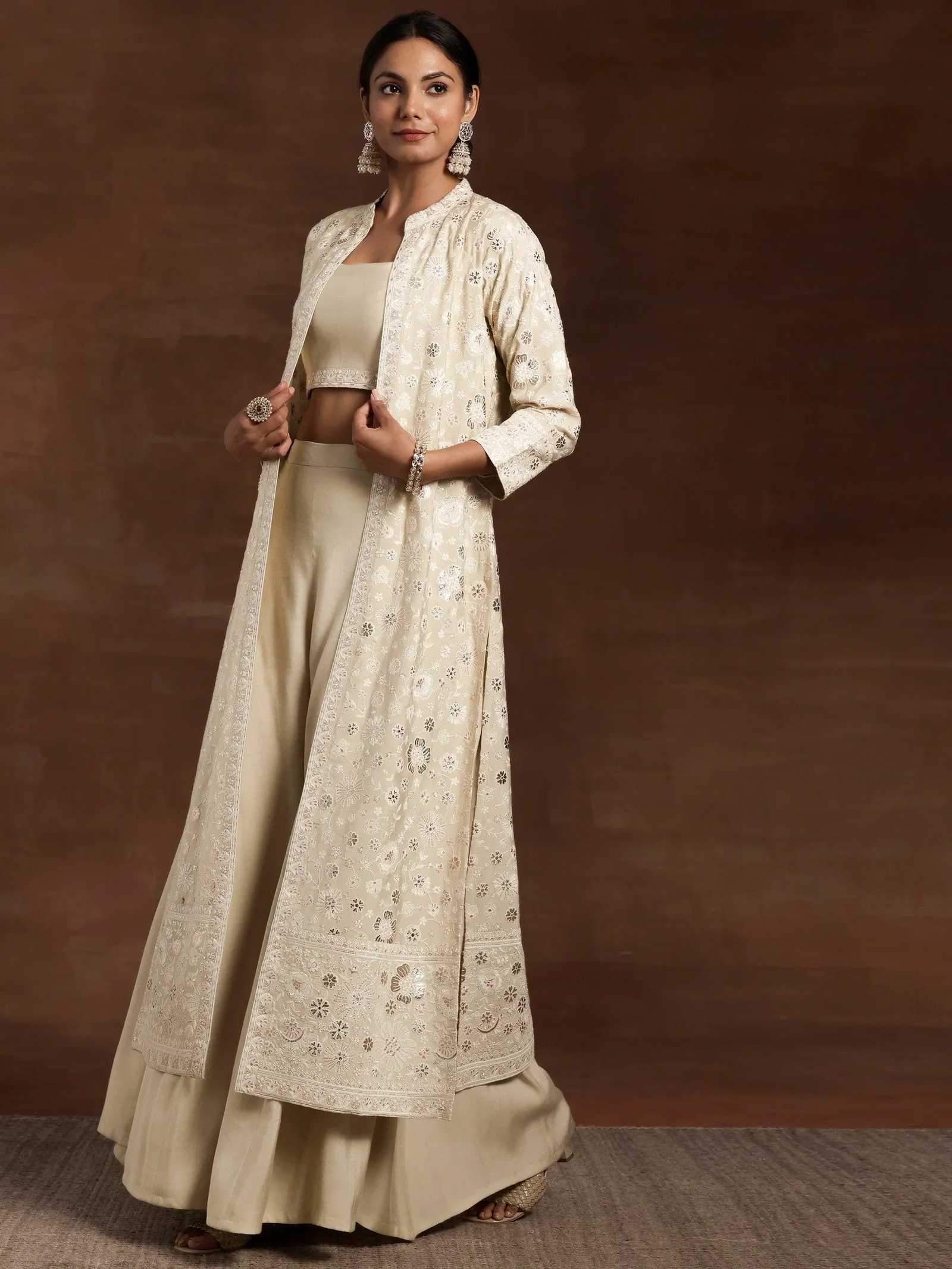 Elevate your festive wardrobe with this 3-piece beige silk blend co-ord set. The sleeveless crop top features a classic round neckline, perfectly paired with flared palazzo pants designed with a partially elasticated waistband for a comfortable fit. The highlight of this set is the longline shrug with a refined mandarin collar, adorned with delicate cutwork, intricate floral embroidery, and shimmering sequins. The luxurious silk blend fabric drapes beautifully, making it an elegant choice for festive gatherings, evening events, or special celebrations.