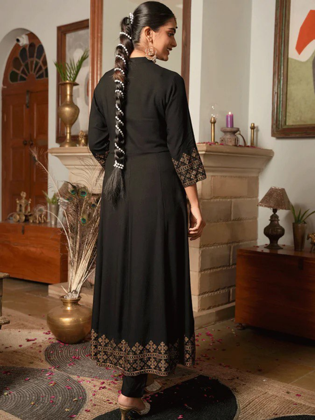 Paired with solid black viscose trousers, the set ensures comfort and a balanced look. Completing the ensemble is a matching black dupatta with delicate gold foil print, adding an extra layer of sophistication and charm.