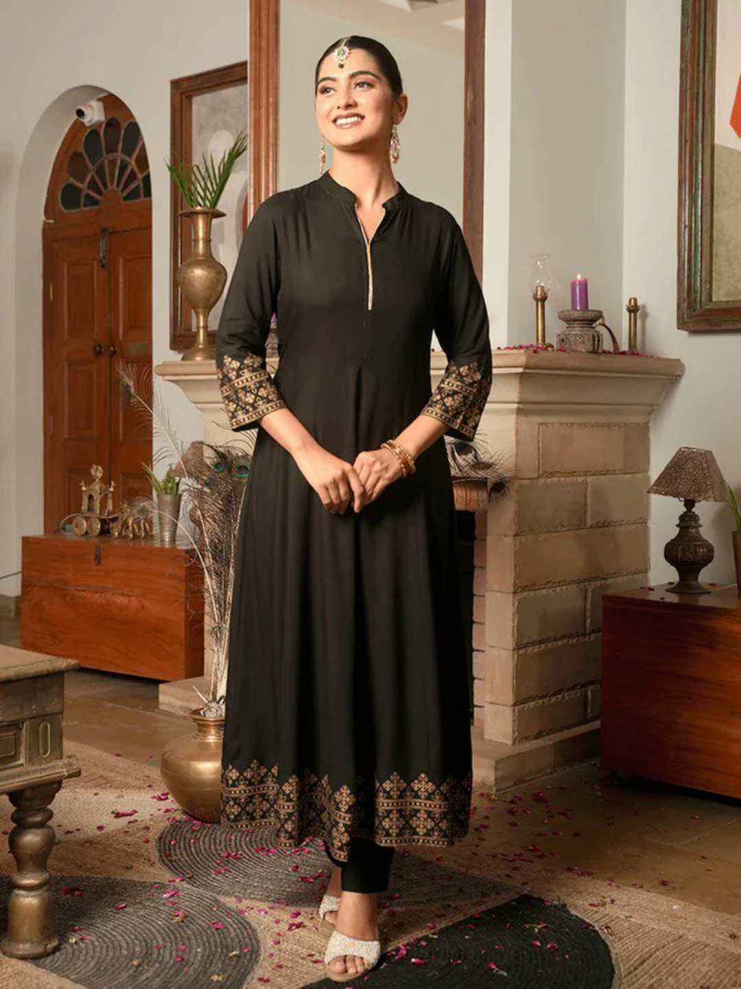 The Anarkali-style kurta is crafted from smooth viscose fabric, offering a soft and comfortable feel while maintaining a graceful flow. The kurta features a stylish Mandarin collar neckline with a sleek front zip detail, adding a contemporary touch to the classic silhouette. The 3/4 sleeves are beautifully highlighted with gold foil print, giving the outfit a refined festive appeal. The calf-length design enhances the elegant flare of the Anarkali shape.