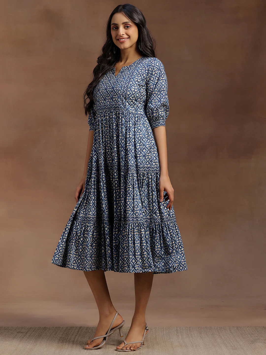 Elevate your everyday style with this blue printed cotton A-line midi dress. Designed with a flattering sweetheart neckline and charming three-quarter puff sleeves, it blends comfort with elegance. The ethnic motifs print adds a touch of artistry, while the flared hemline provides ease of movement. Crafted from breathable cotton, this dress is perfect for casual outings or daily wear, keeping you stylish and comfortable throughout the day.