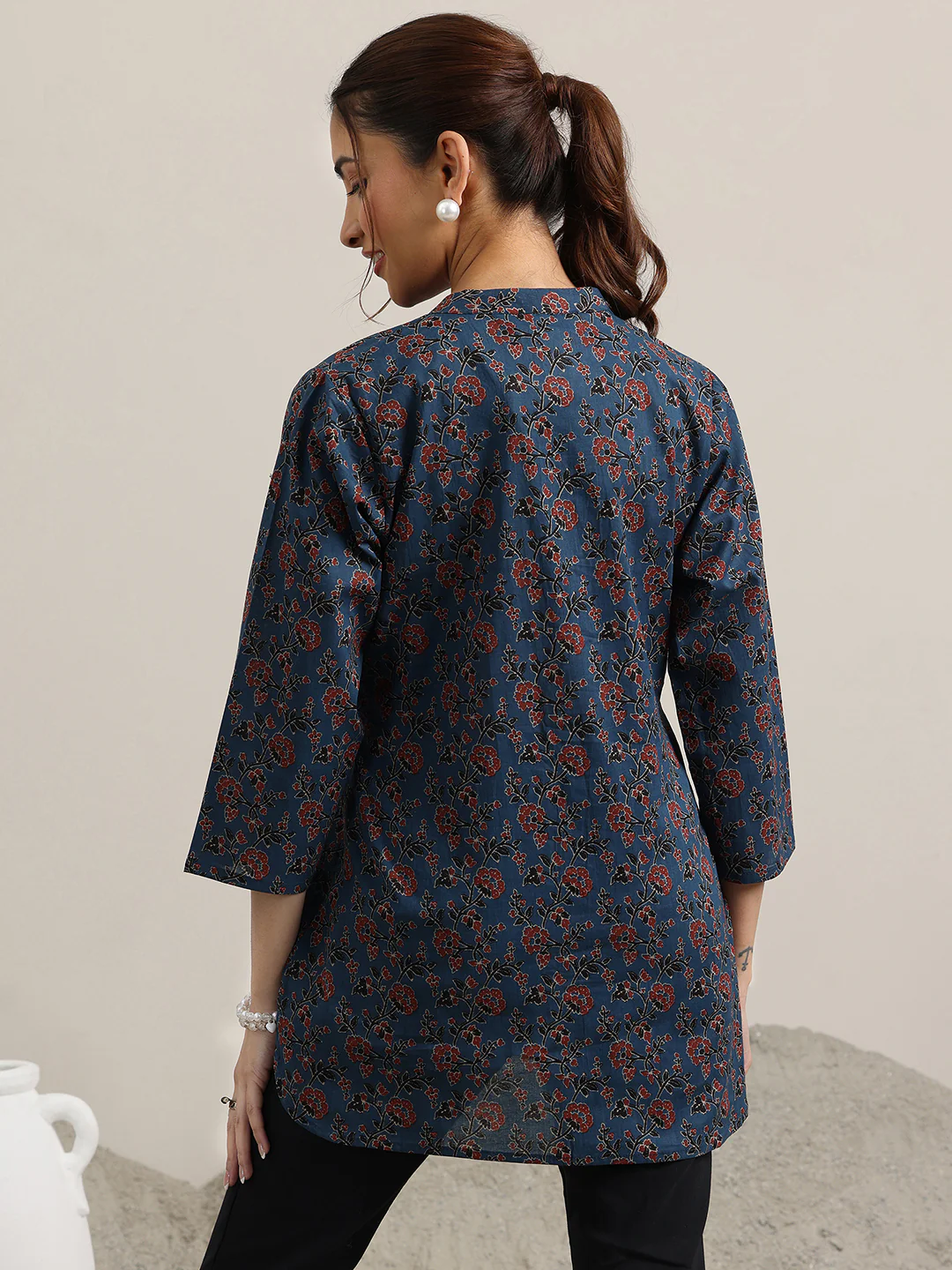 This blue printed cotton straight kurti offers a fresh and versatile look for your casual wardrobe. Designed with a mandarin notched neckline and three-quarter sleeves, it brings a subtle blend of style and comfort. The breathable cotton fabric keeps you cool throughout the day, while the floral prints add a touch of elegance. Its mid-thigh length and side slits make it easy to pair with trousers, leggings, or palazzos, making it a go-to choice for work, casual meet-ups, or relaxed weekend outings.