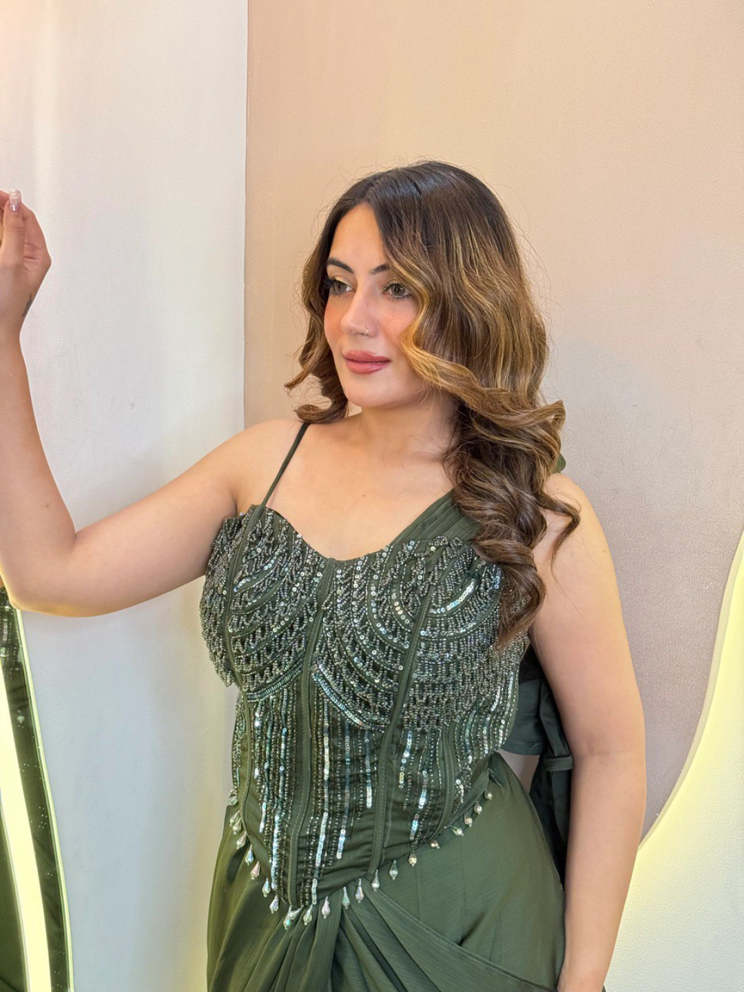 Crafted from premium pure chinnon fabric, this ready-to-wear drape saree offers a soft, fluid fall that beautifully enhances your silhouette. The deep green tone exudes richness and elegance, making it a perfect choice for evening functions, receptions, cocktail nights, and festive celebrations.