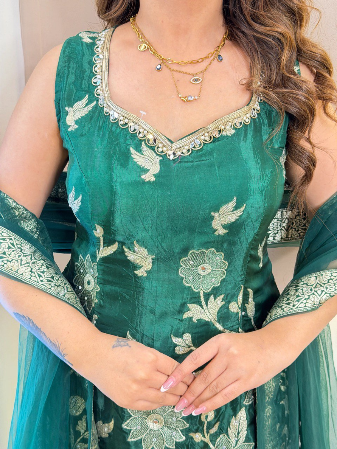 Crafted from premium Banarasi silk fabric, the suit features intricate woven patterns that highlight the richness and heritage of traditional Indian textiles. The deep emerald green shade gives the outfit a regal and graceful appeal, making it an excellent choice for evening events and grand celebrations. The suit is adorned with beautiful handwork detailing, adding refined texture and enhancing the overall elegance of the design.
