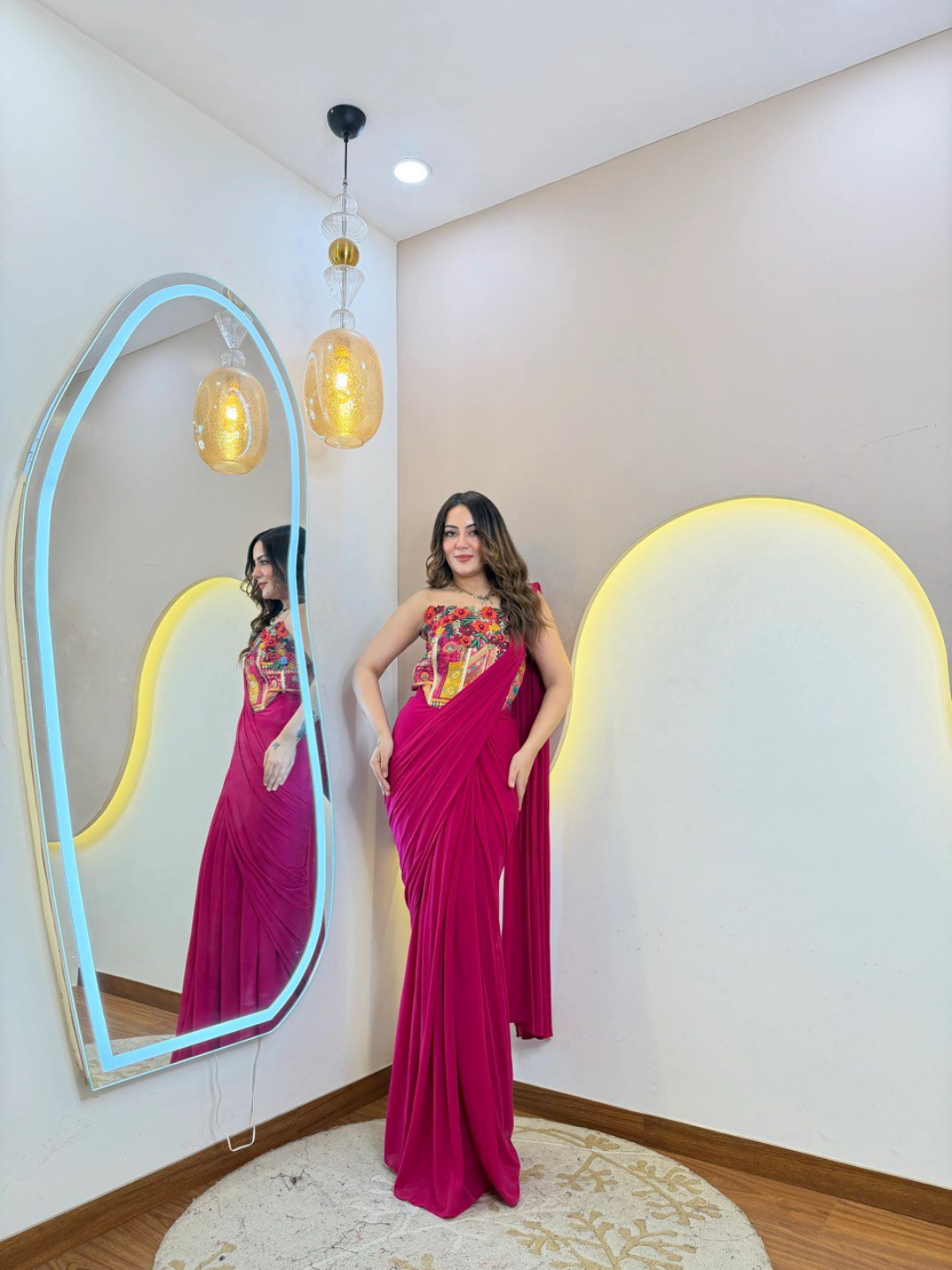 Make a bold style statement with the stunning Fuchsia Glam Party Wear Drape Saree, designed to bring effortless elegance to your festive wardrobe. Crafted from premium imported fabric, this saree offers a smooth, flowy drape that enhances your silhouette beautifully.