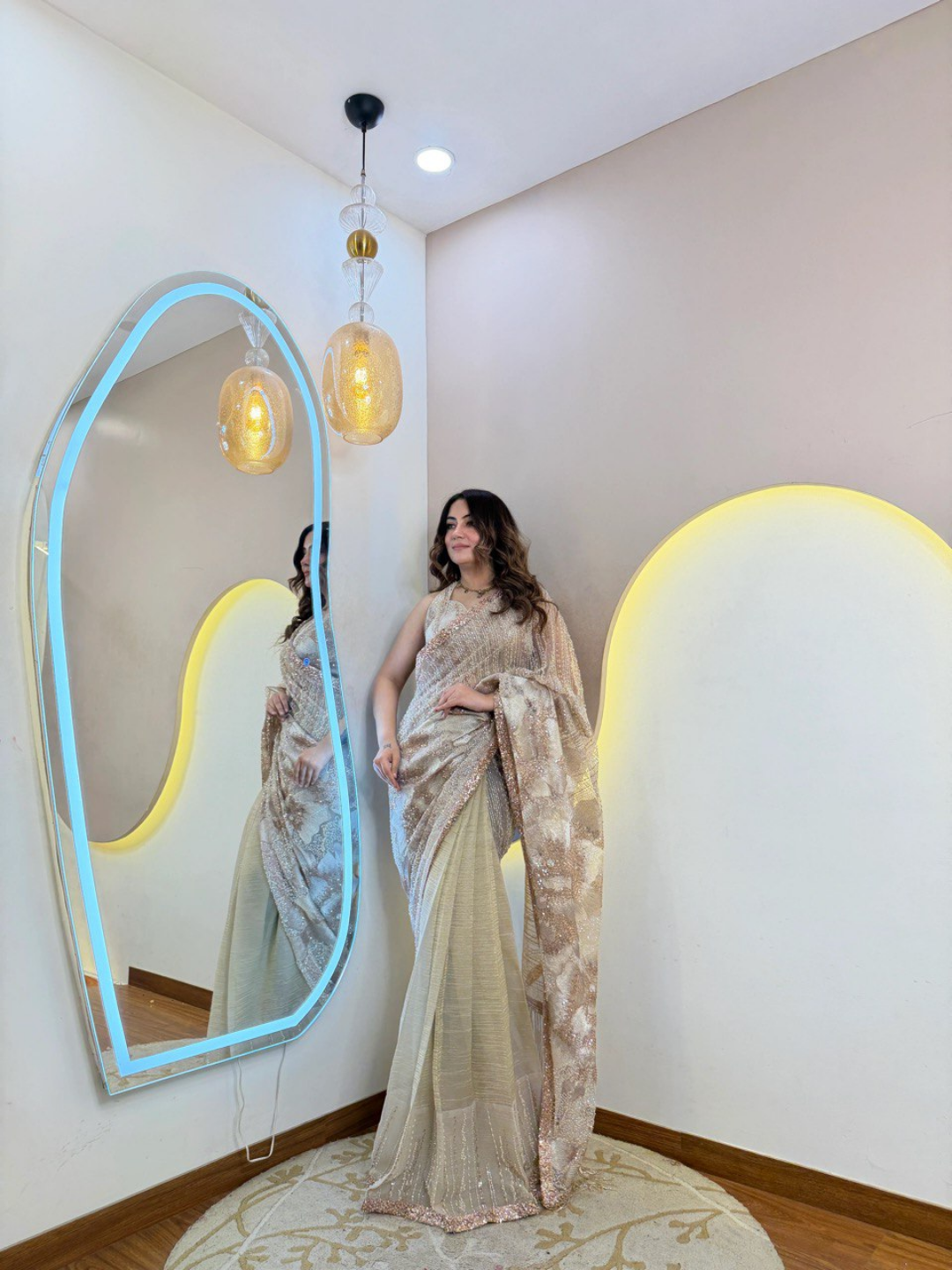 The subtle golden-beige tone makes it ideal for receptions, engagement ceremonies, cocktail evenings, and festive celebrations. Lightweight and breathable, it ensures you stay comfortable while looking effortlessly elegant.