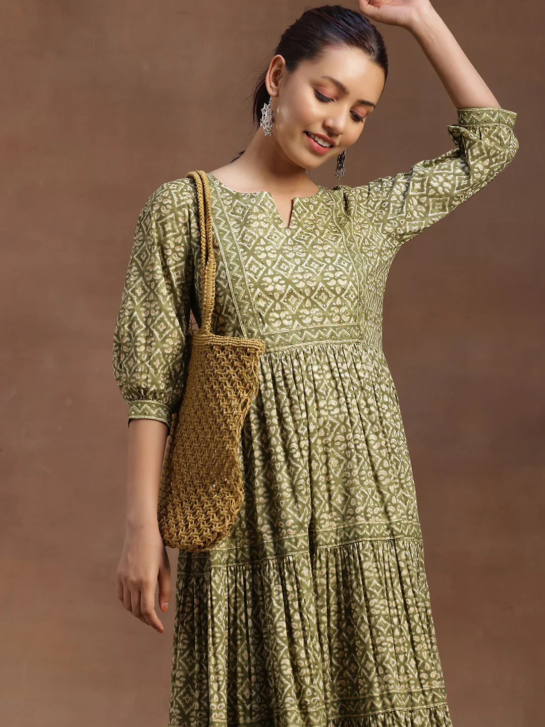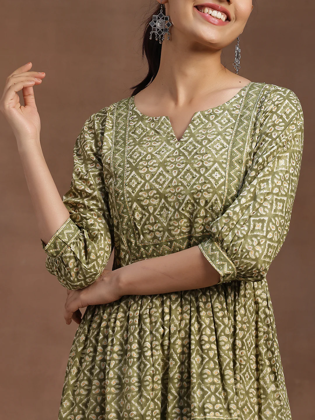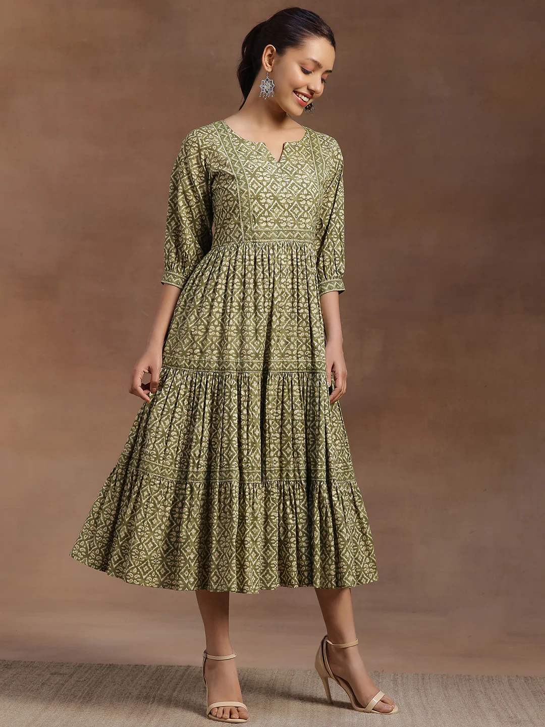 Infuse your wardrobe with vibrant charm in this green printed cotton A-line midi dress. Crafted from breathable cotton, it features a flattering sweetheart neckline with a subtle notch, three-quarter puff sleeves, and a graceful flared hemline. Adorned with intricate ethnic motif prints, this dress combines comfort with cultural elegance, making it an ideal choice for casual outings or daily wear. Pair it with delicate jewellery and comfortable flats for an effortlessly stylish look.