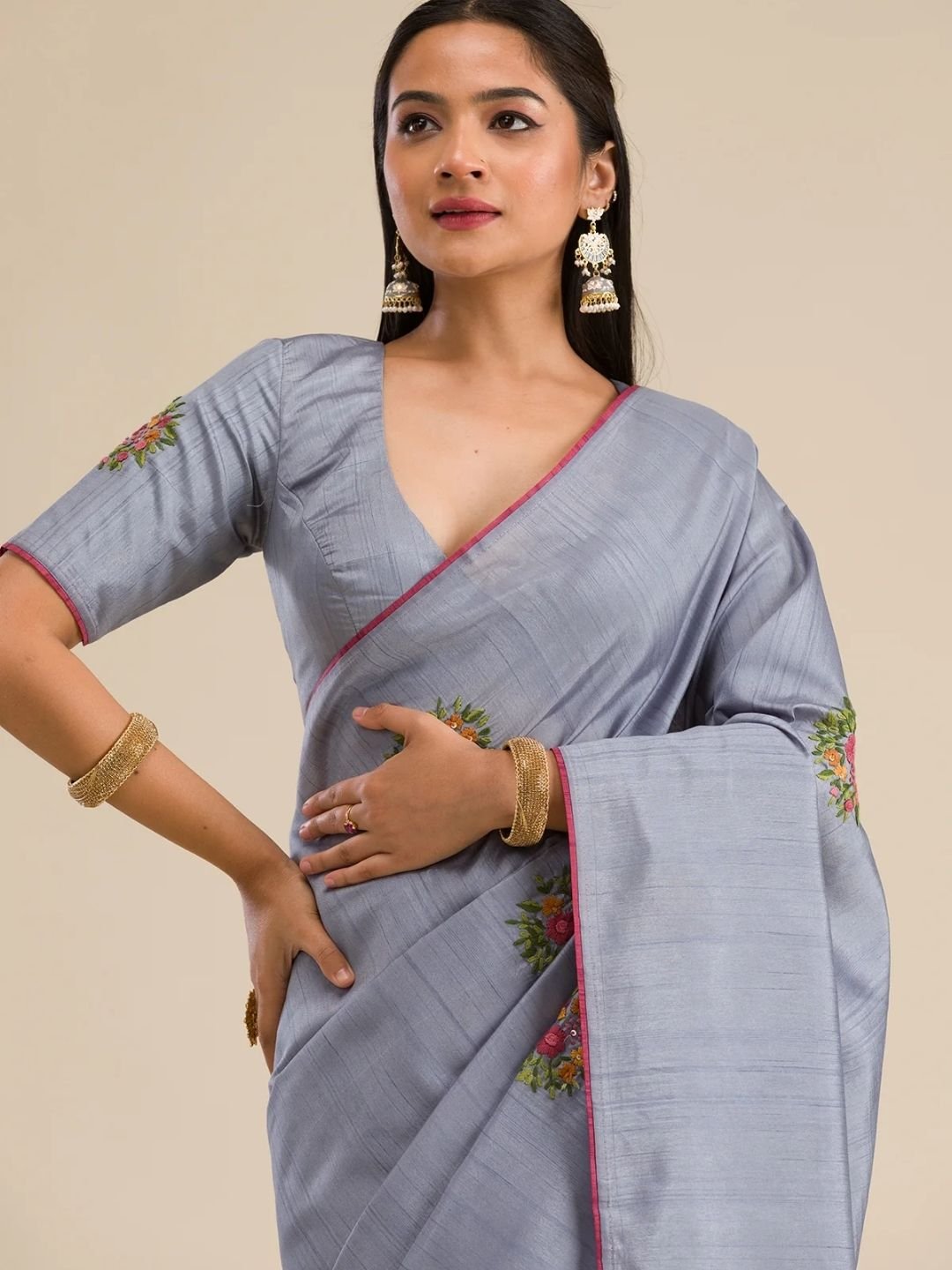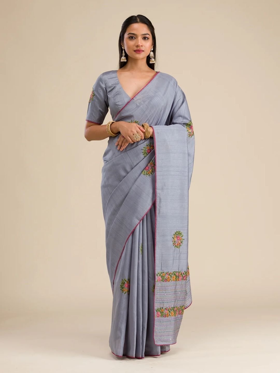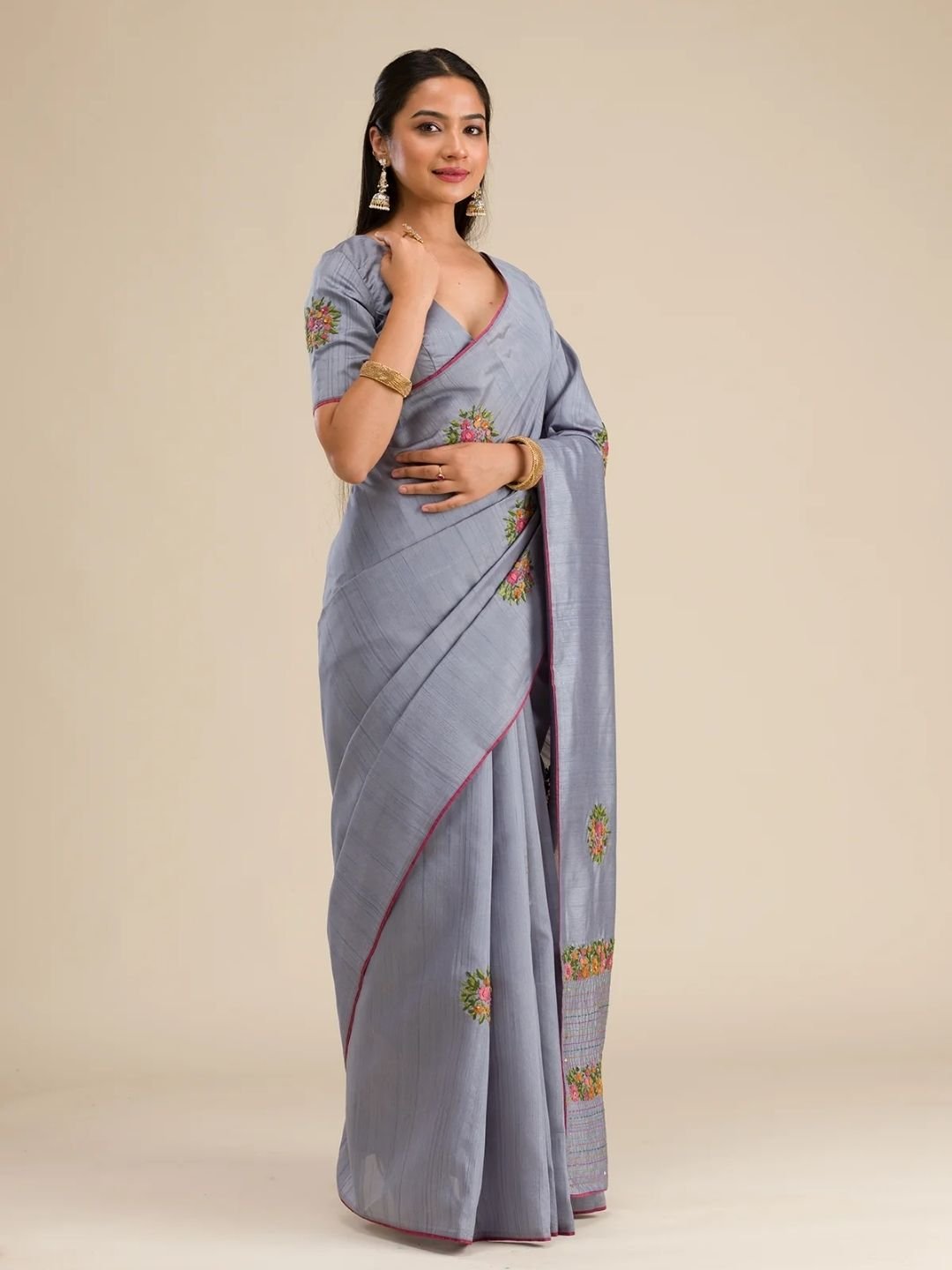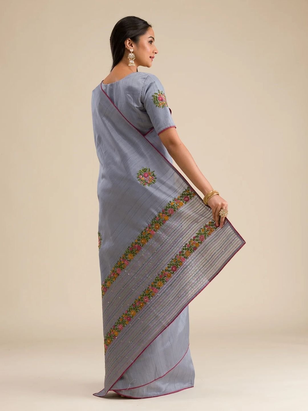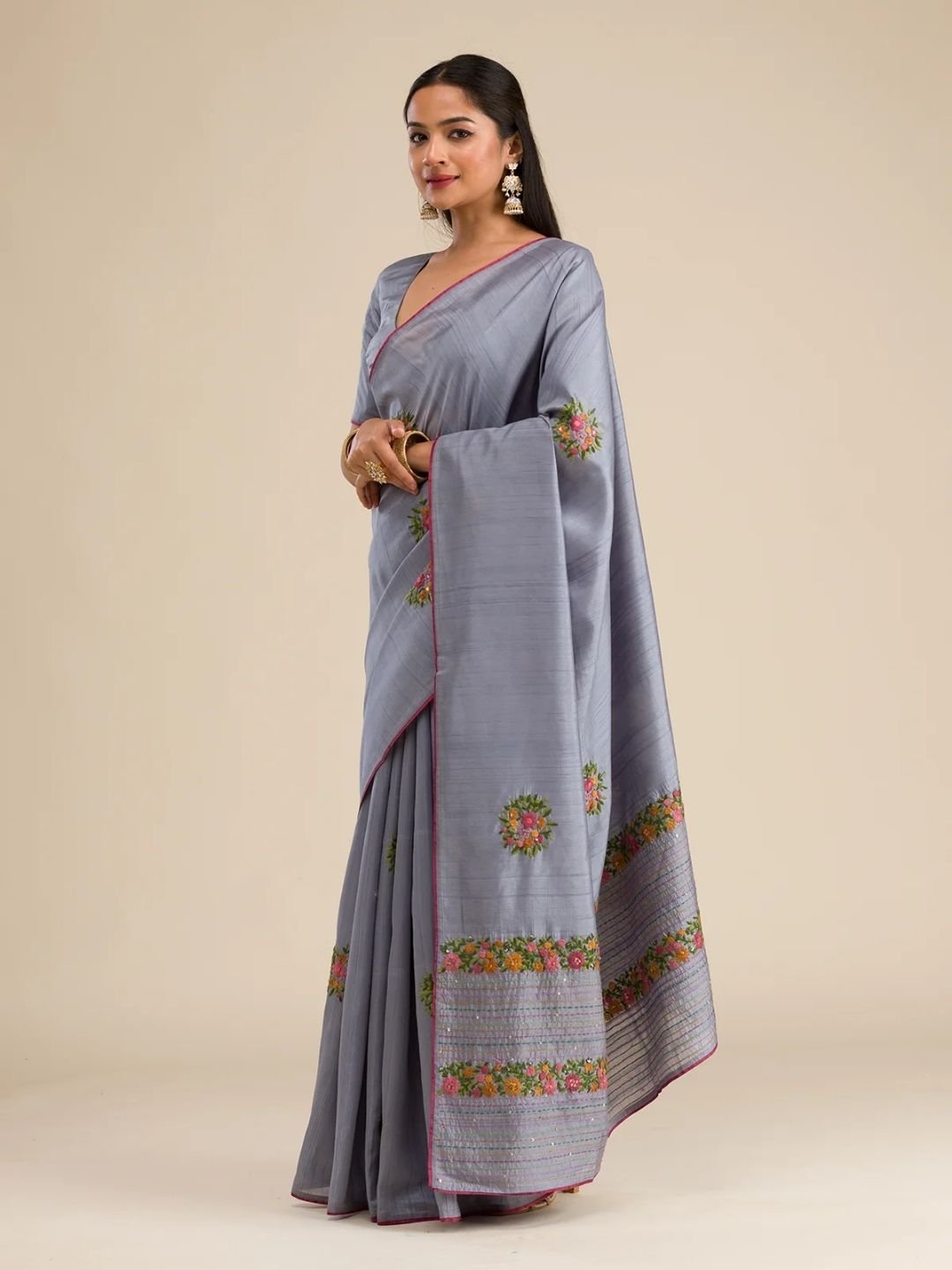 This graceful grey saree in soft silk fabric is a timeless choice for women who love classic elegance with a modern touch. Adorned with intricate threadwork embroidery, it effortlessly blends sophistication with style. The saree comes with an unstitched blouse piece, giving you the freedom to design it as per your preference. A perfect drape for weddings, festive occasions, or celebrations – backed with the Koskii promise of premium quality.