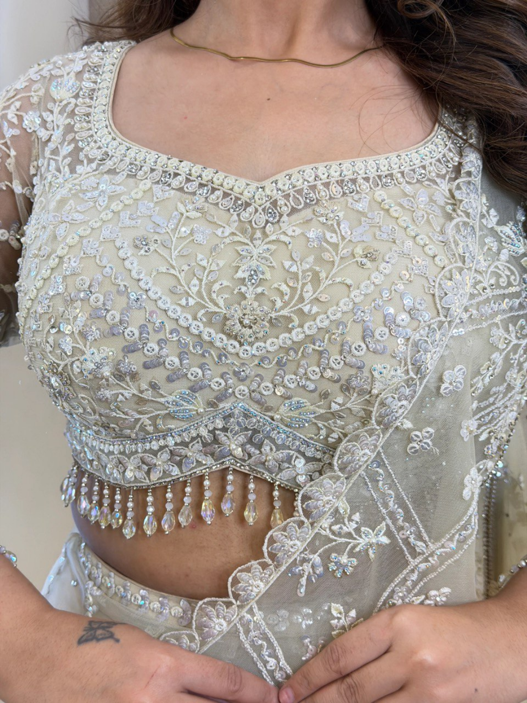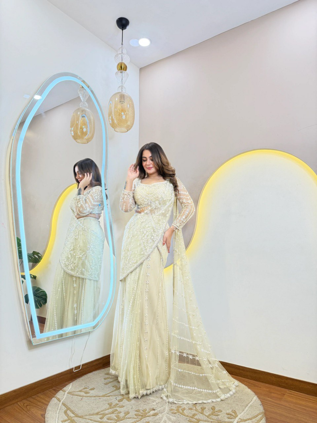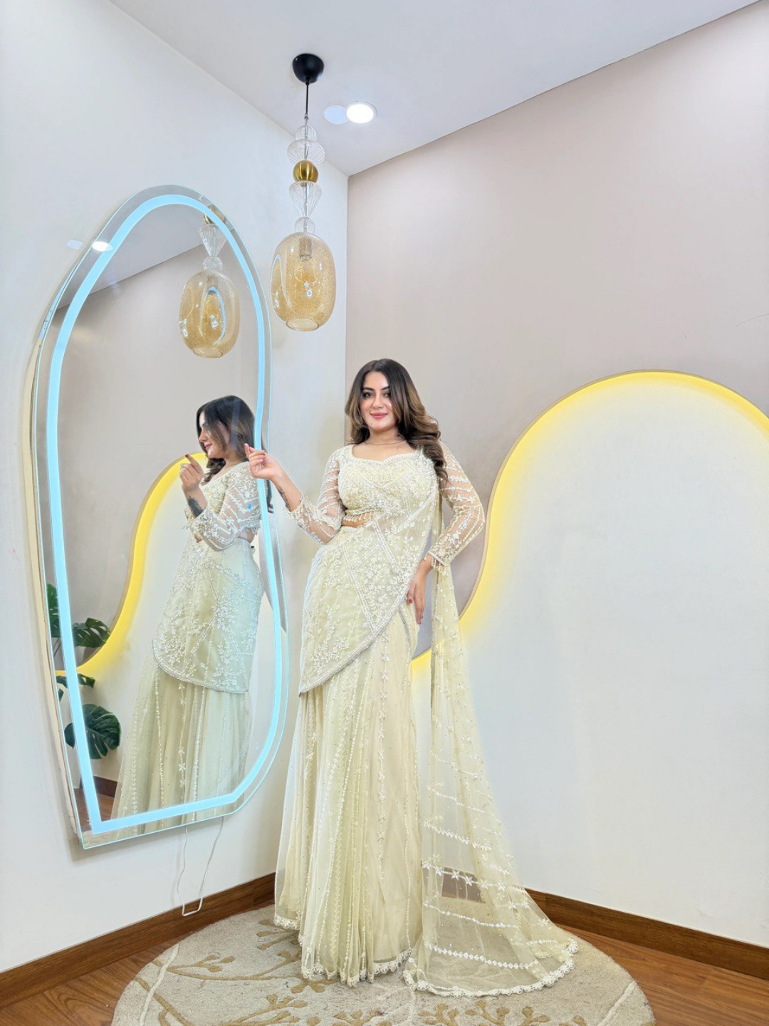 The soft ivory tone exudes grace and subtle glamour, making it an ideal choice for receptions, engagement ceremonies, festive celebrations, and special evening occasions. The delicate net drape flows effortlessly, creating a flattering silhouette that feels as light as it looks stunning.