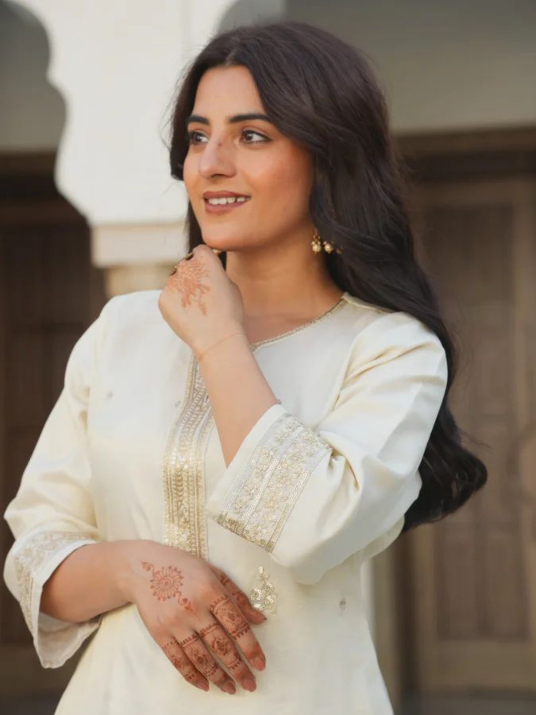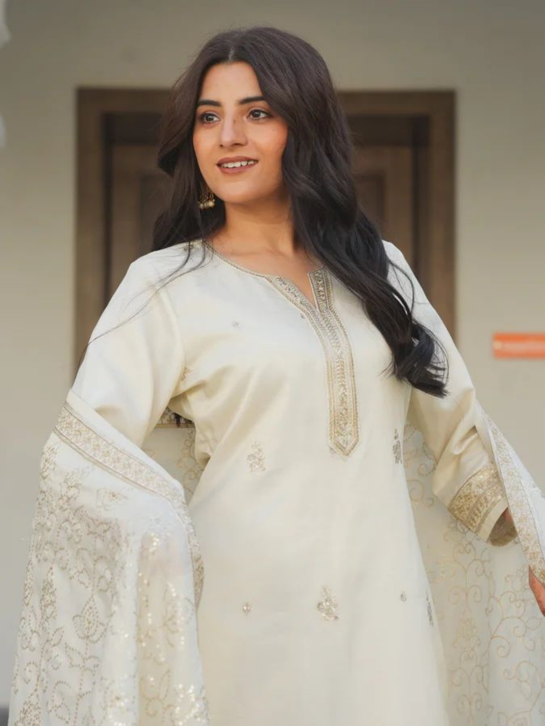 Step into understated luxury with the Ivory Noor Tissue Suit Set by Boho Naari — a design that blends minimal sophistication with traditional craftsmanship.