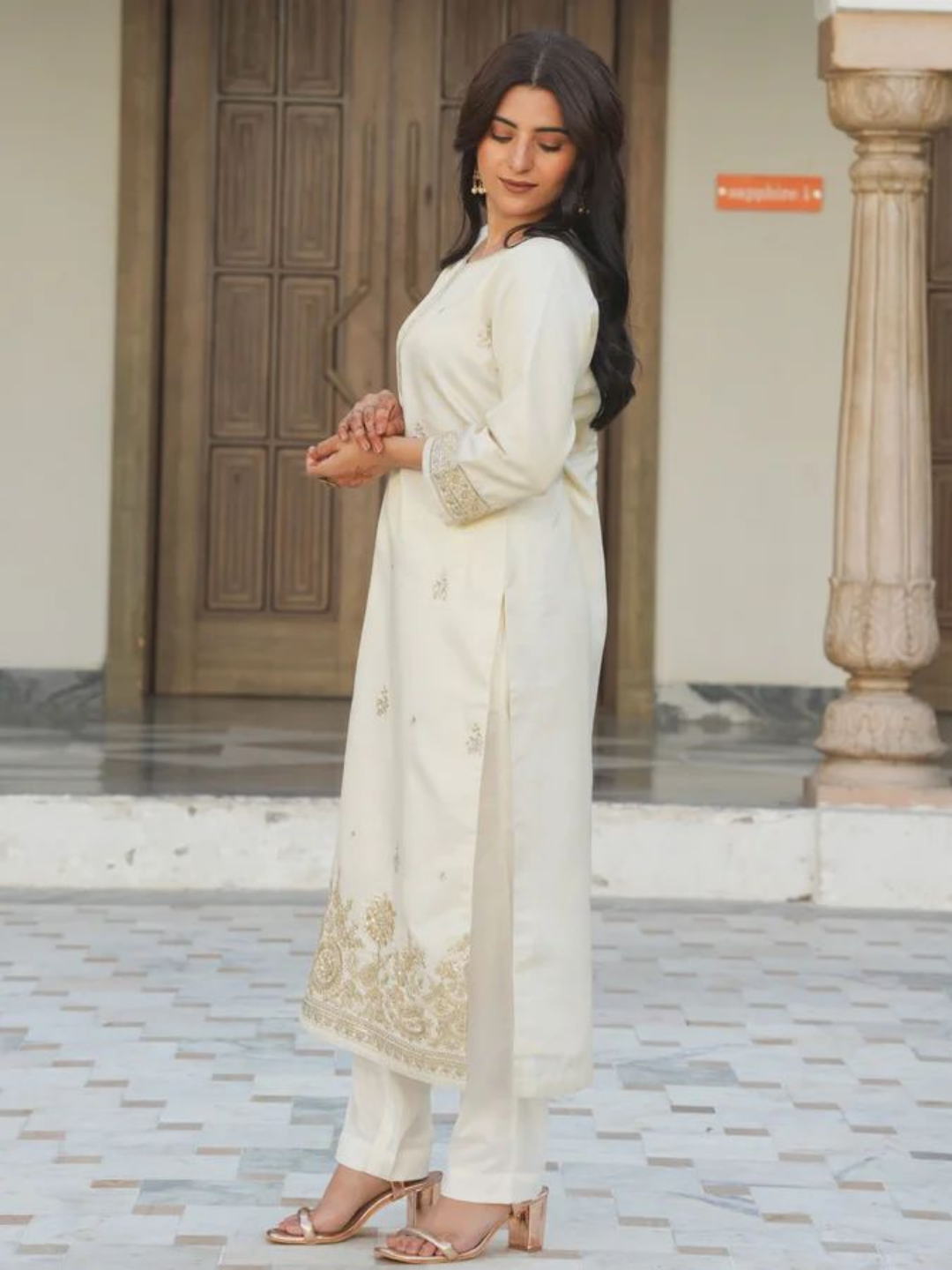 Crafted from premium tissue fabric, this off-white ensemble radiates subtle shine and refined elegance. The delicate cord, zari, and sequins work adds graceful detailing along the neckline and borders, creating a soft yet luxurious festive look.