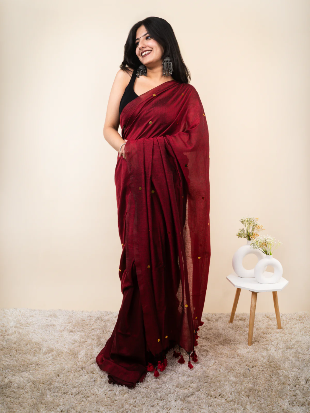 The pallu is enhanced with charming hand-tied tassels, adding a subtle artisanal touch that elevates the overall aesthetic. Its minimal yet refined design makes it suitable for casual outings, festive gatherings, cultural events, or everyday ethnic wear.