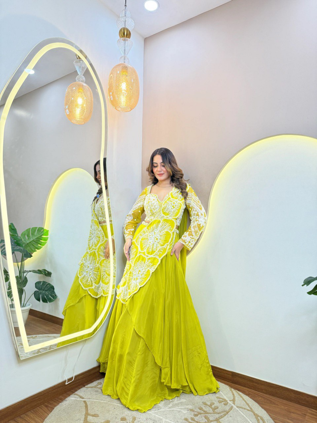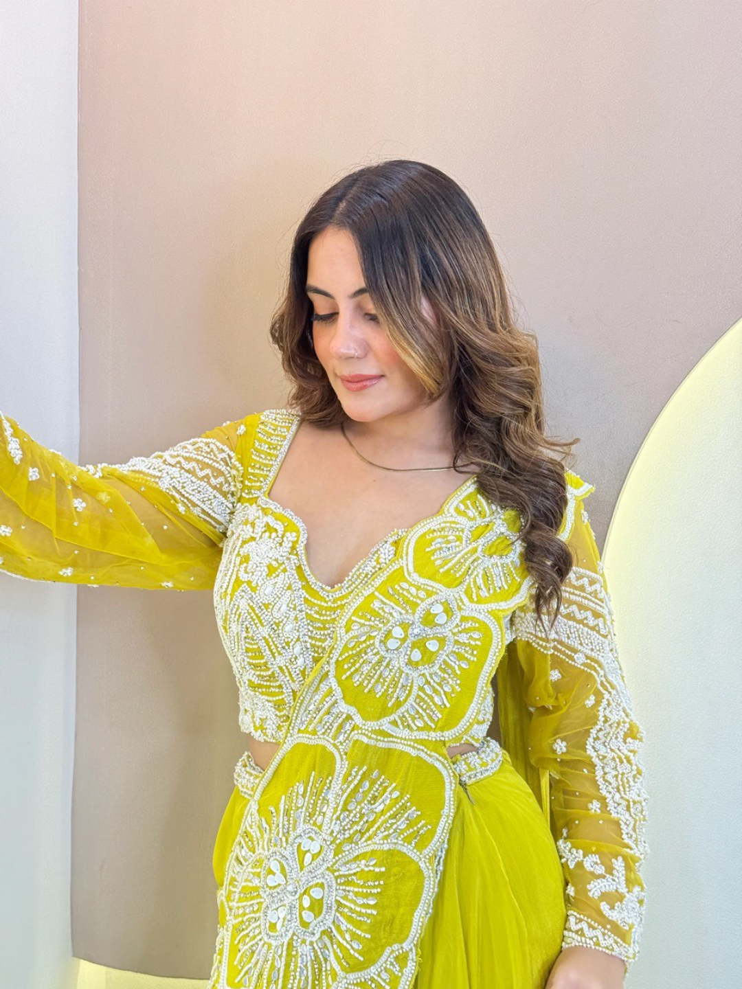 Bright, refreshing, and effortlessly glamorous — the Lemon Bloom Drape Saree is designed to make you stand out at every celebration.