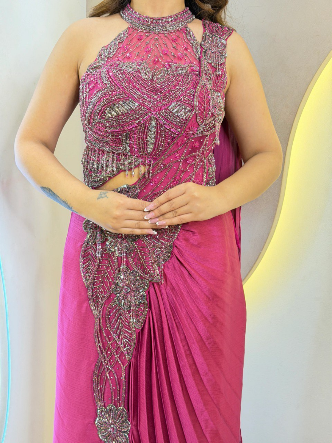 Crafted from premium satin fabric, this ready-to-wear drape saree offers a rich, lustrous finish that flows beautifully with every movement. The luxurious satin texture enhances the vibrant magenta hue, giving the outfit a radiant, high-fashion appeal.