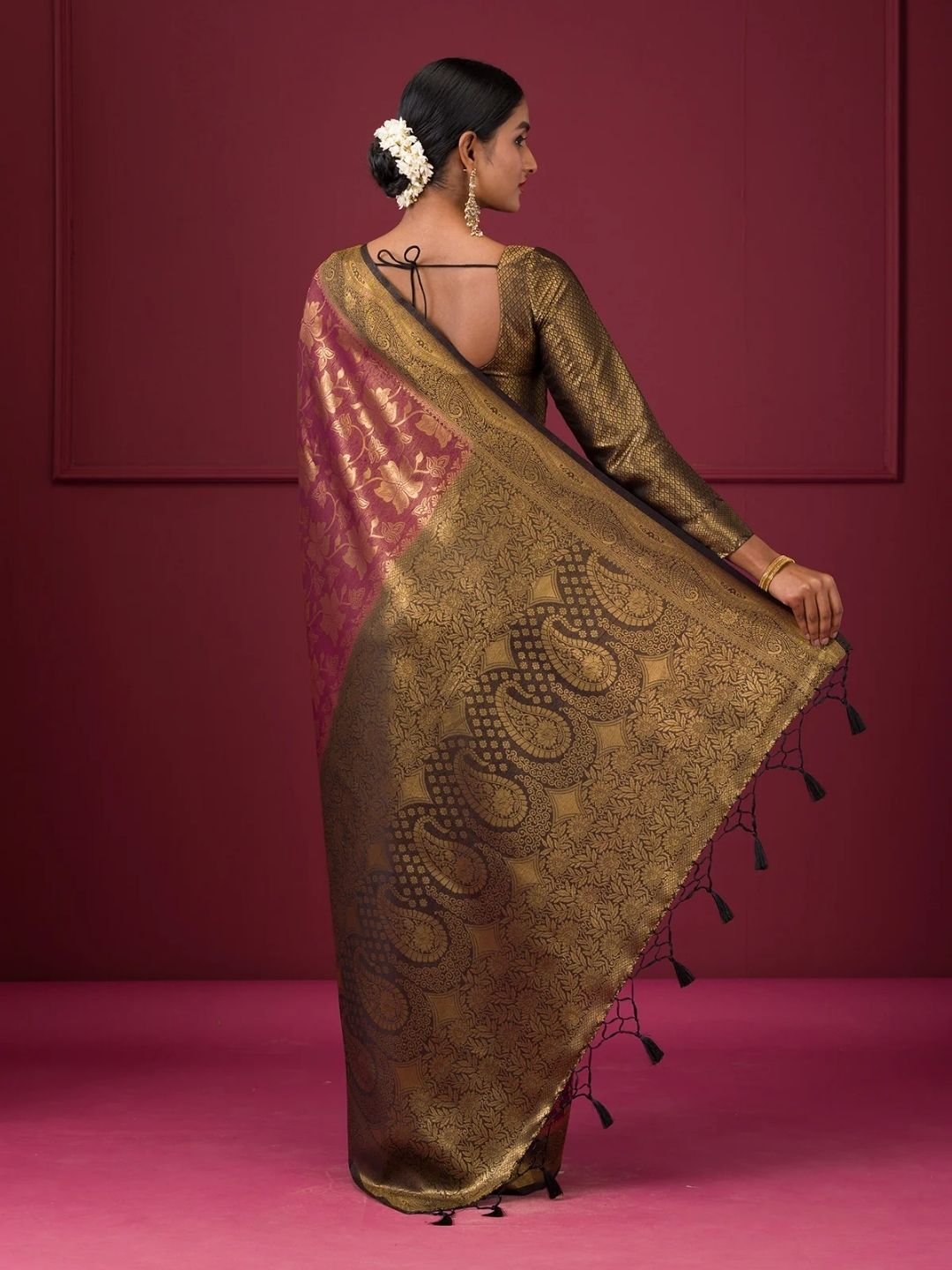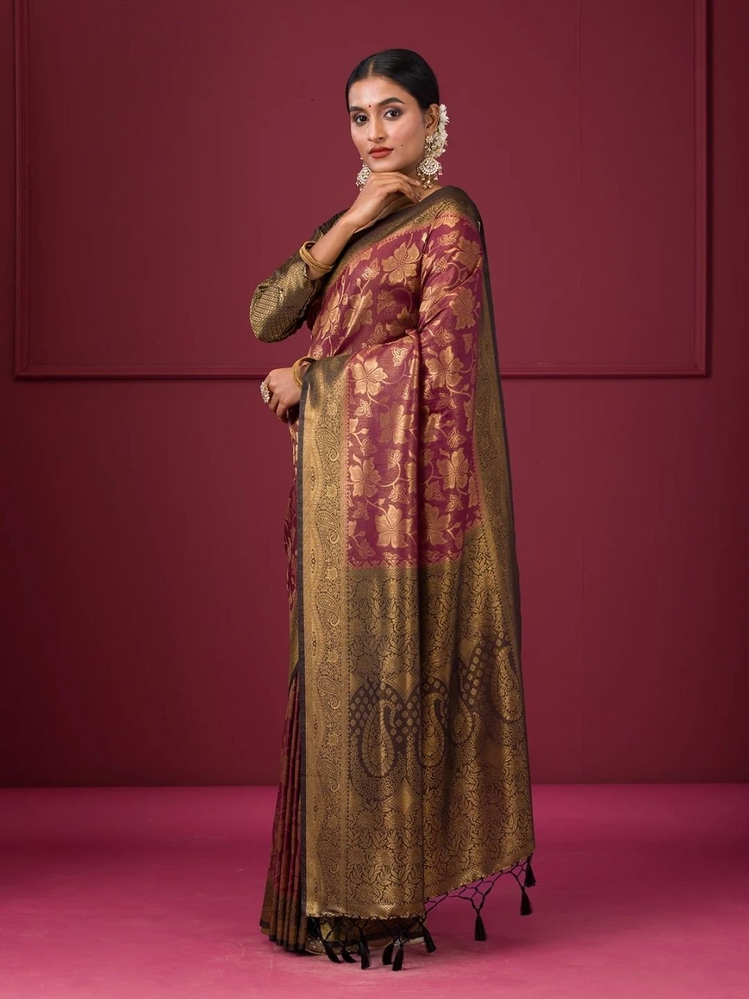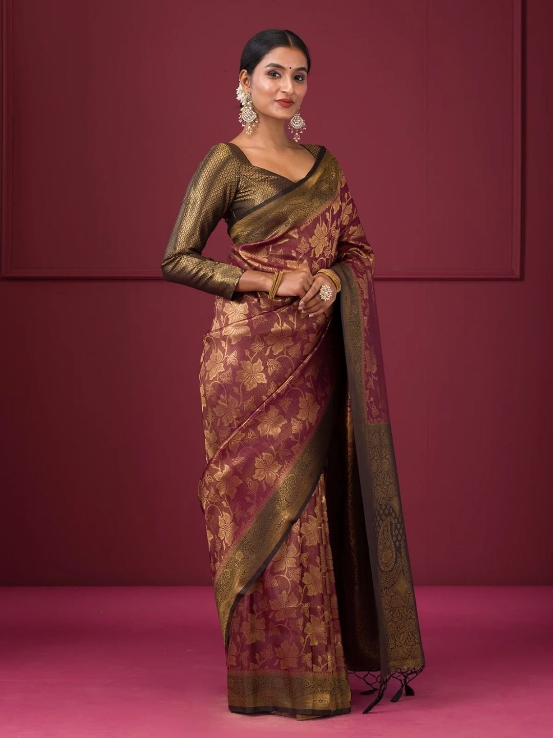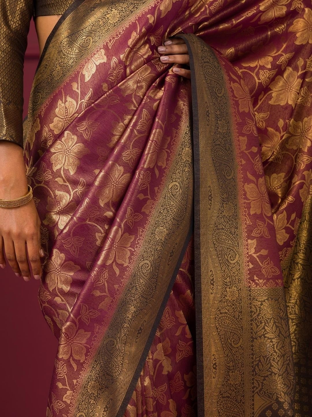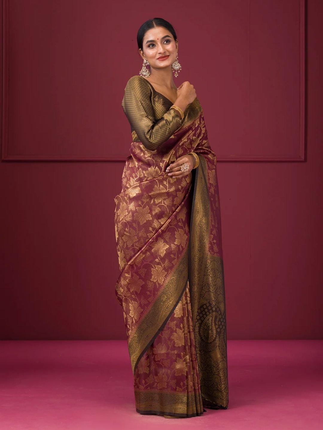 This maroon saree crafted in soft silk fabric exudes grace and sophistication. Enhanced with exquisite zariwork embroidery, it offers a timeless appeal for festive gatherings, weddings, and celebrations. The saree is paired with an unstitched blouse, giving you the freedom to style it as per your preference. Designed with comfort and elegance in mind, this saree is a perfect addition to your wardrobe.