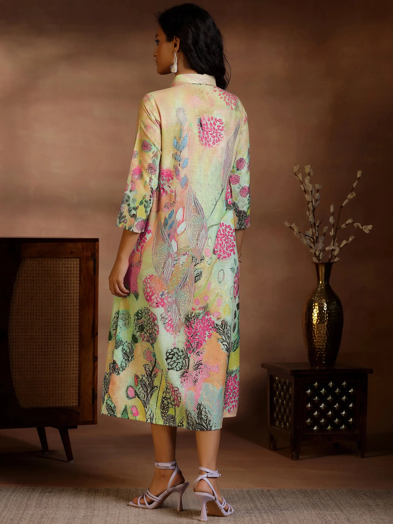 Brighten your wardrobe with this multi printed cotton blend midi shirt dress. Designed with a classic shirt collar and three-quarter regular sleeves, it offers a timeless silhouette with a modern twist. The floral print brings a fresh, vibrant charm, while the flared hemline ensures effortless movement and comfort. Made from a soft cotton blend, this dress is perfect for daily wear, keeping you stylish and at ease throughout the day.
