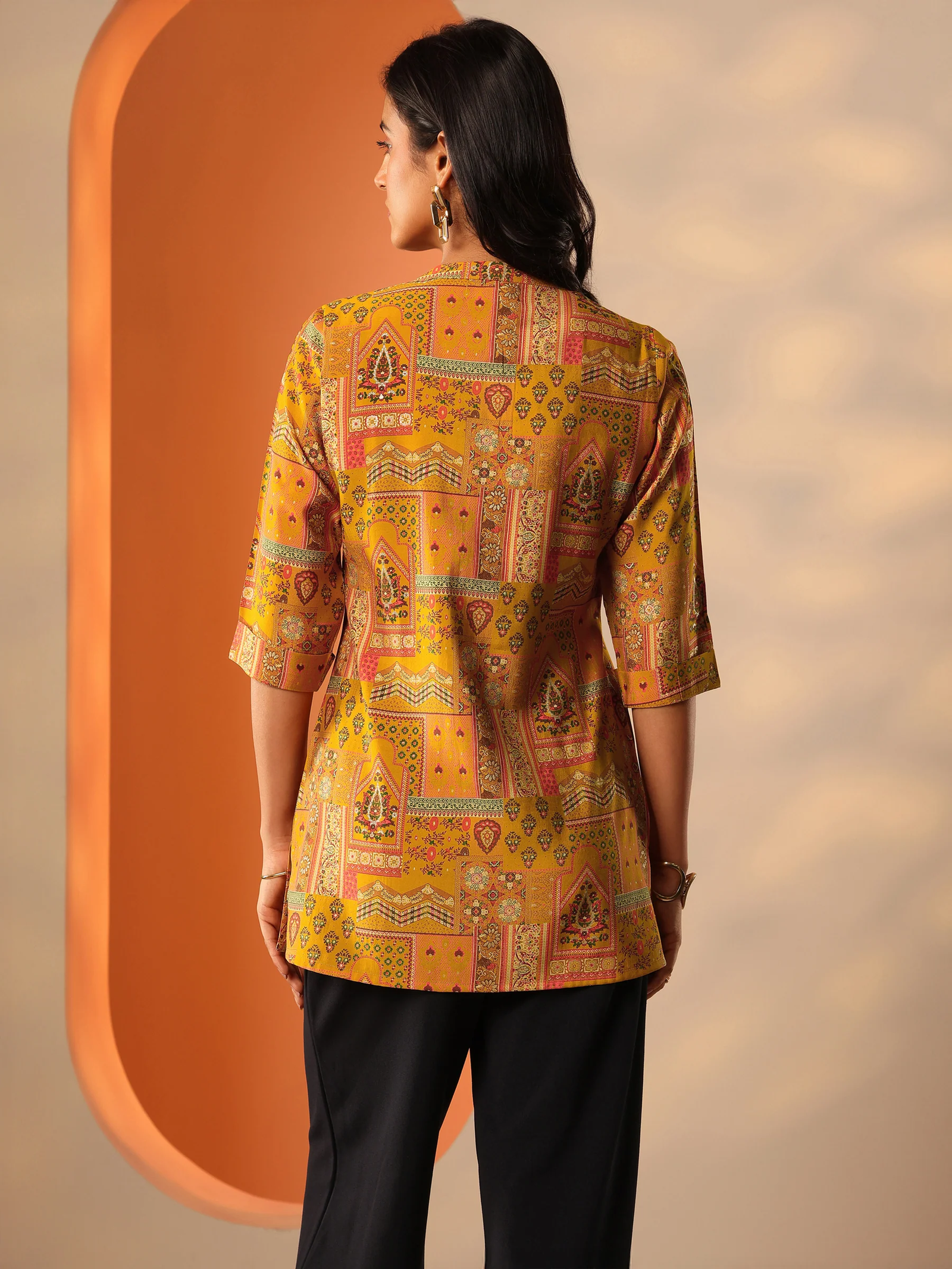 Pattern: Ethnic motif prints that stand out beautifully against the mustard base
