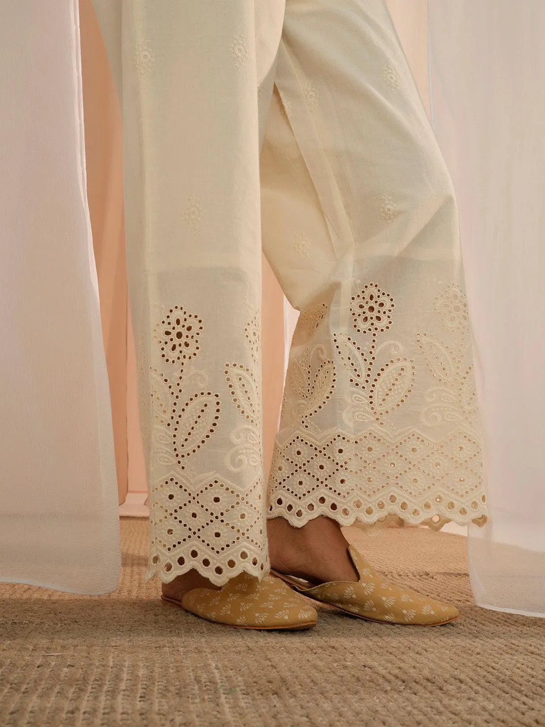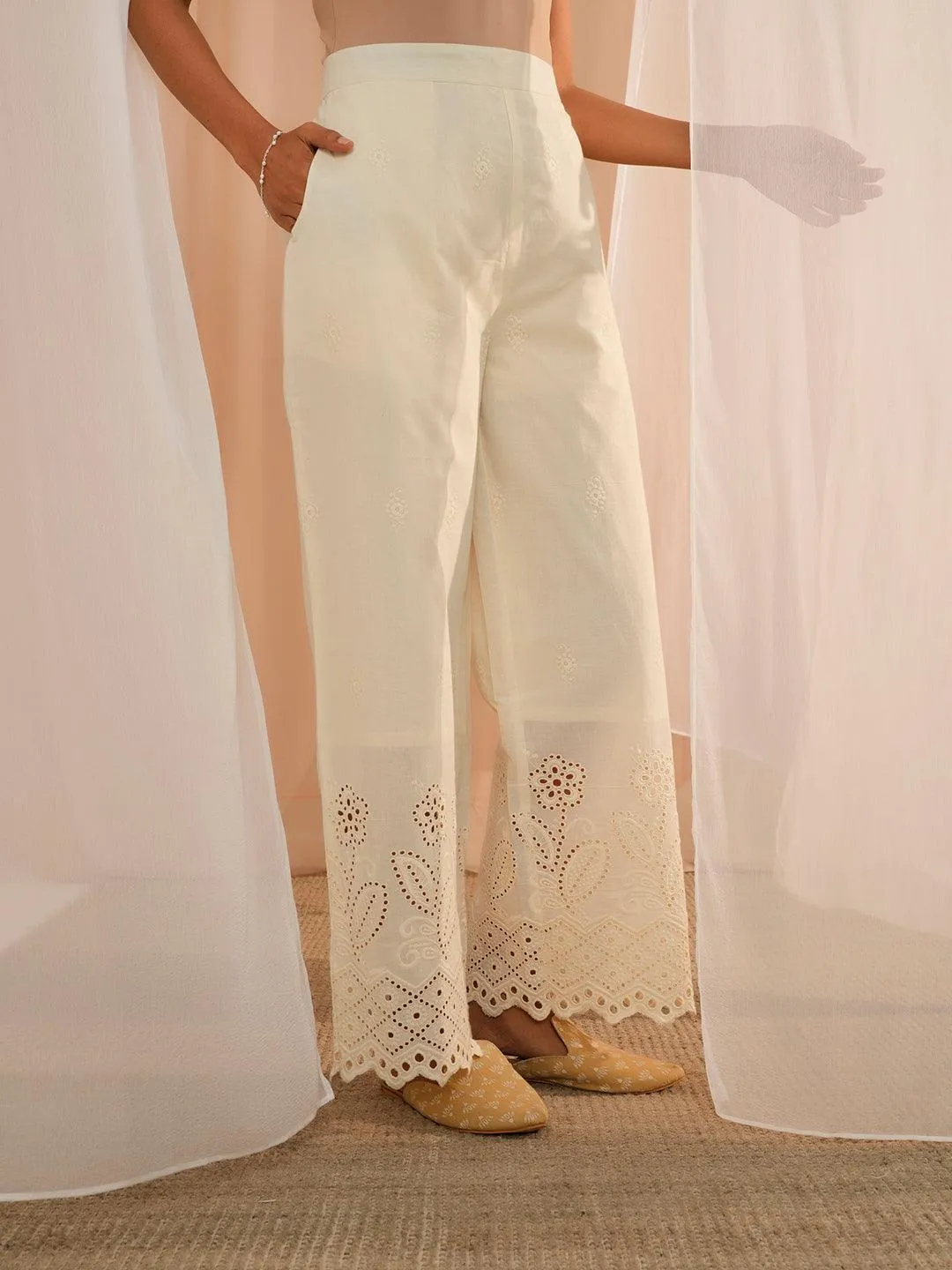 Elevate your everyday style with these off-white cotton palazzo pants. Featuring delicate cutwork, intricate thread work, and charming schiffli embroidery, this pair brings a touch of artisanal flair to your casual wardrobe. The wide-leg fit ensures easy movement and breathability, while the partially elasticated waistband offers comfort without compromising style. With functional side pockets, these palazzos are as practical as they are elegant — perfect for pairing with your favourite kurtas or tunics for a relaxed yet refined look.