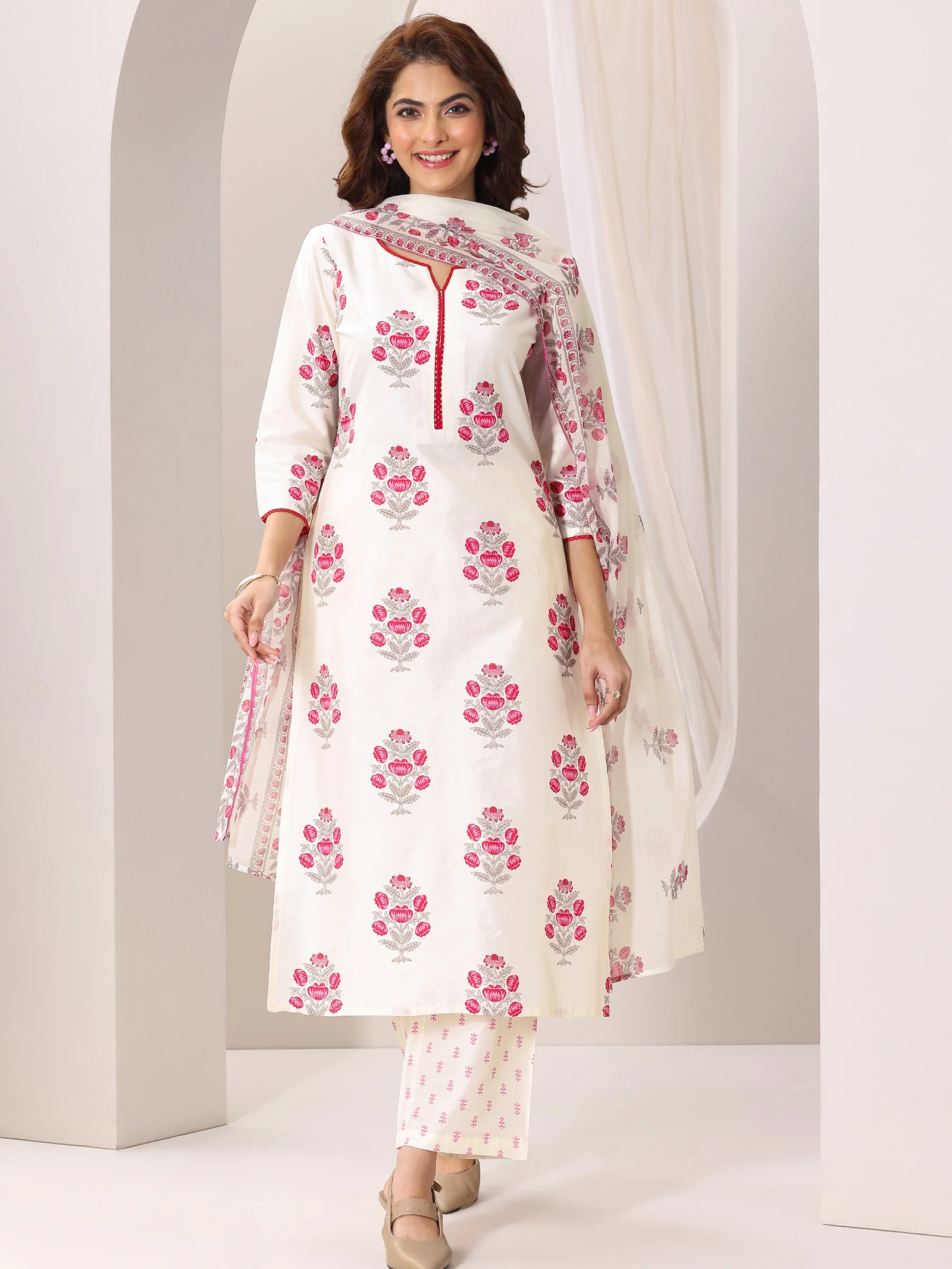 Effortless grace meets everyday comfort in this 3-piece off-white Chanderi silk straight suit set. The straight-fit kurta is adorned with delicate floral prints and features a flattering notched neckline with three-quarter sleeves, giving it a timeless charm. Coordinated printed palazzo pants offer both ease and elegance, thanks to their partially elasticated waistband for a comfortable fit. Completing the set is a soft silk chiffon dupatta with matching prints and piping-trim accents, adding a refined touch. Perfect for brunches, day events, or casual festive gatherings, this suit set is a blend of sophistication and relaxed style.