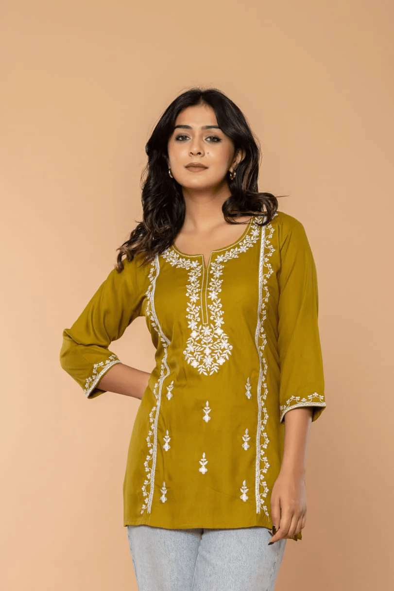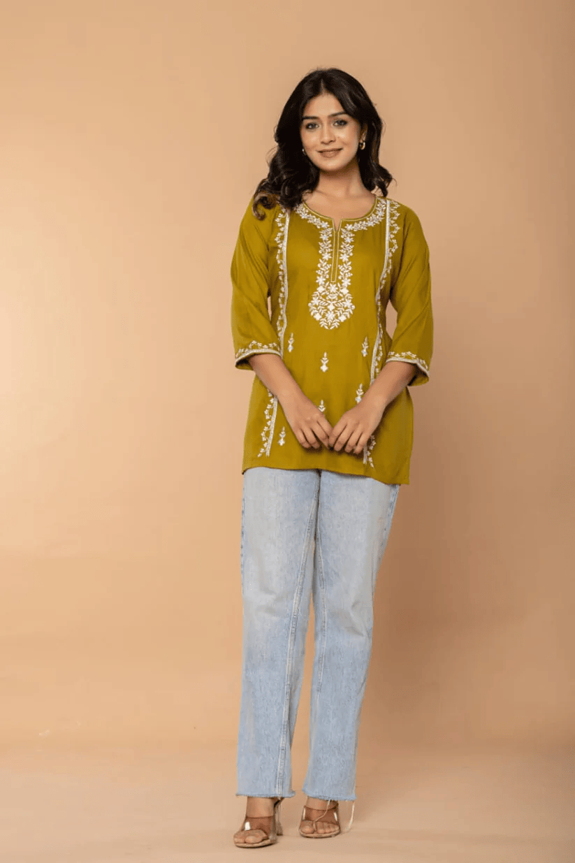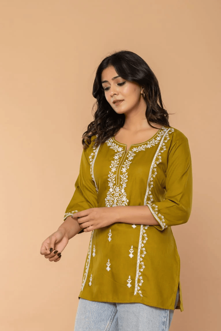 Let your style bloom with the Olive Bloom Embroidery Top by Boho Naari. This beautifully handcrafted piece brings together intricate embroidery and a flattering silhouette, offering a subtle nod to tradition with a modern edge. Each stitch tells a story—carefully designed to highlight the artistry behind every detail.