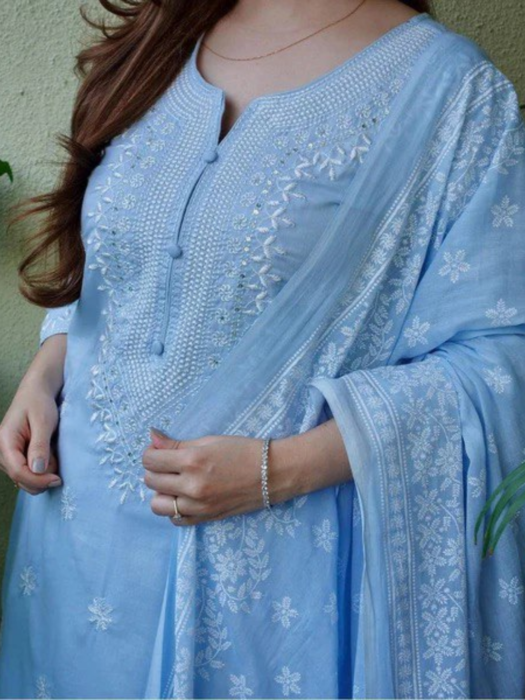 Refresh your ethnic wardrobe with this elegant Powder Blue Embroidered Cotton Suit Set with Dupatta, designed to offer effortless grace and everyday sophistication. Crafted from soft and breathable cotton fabric, this three-piece ensemble ensures comfort while maintaining a refined festive appeal.