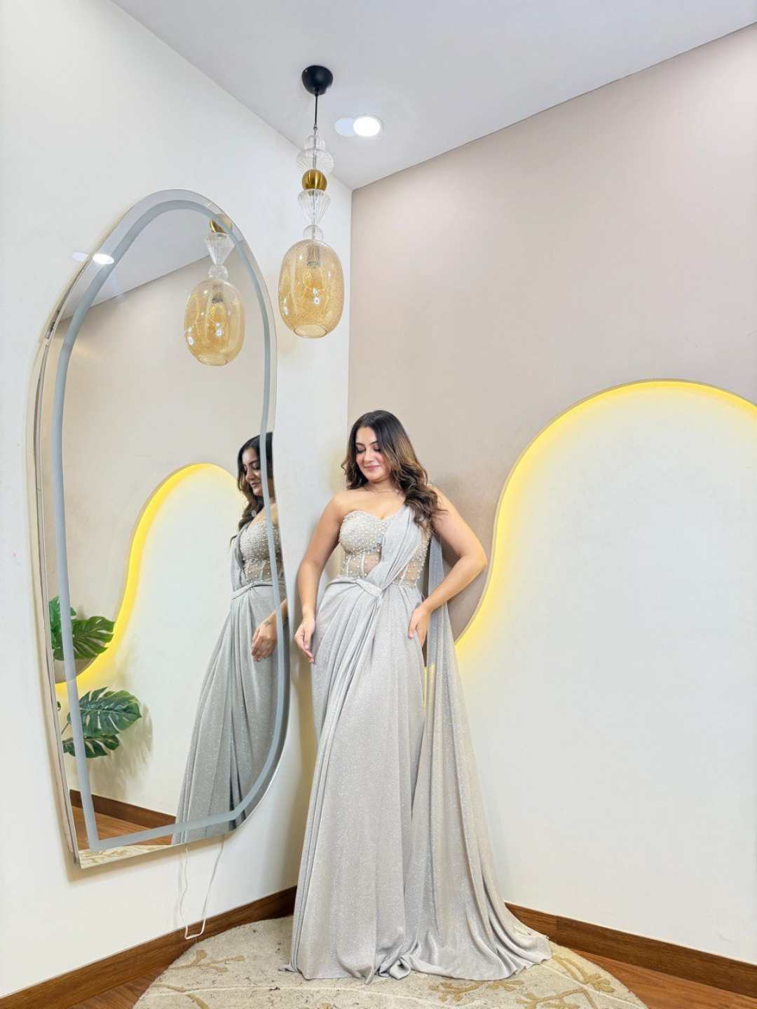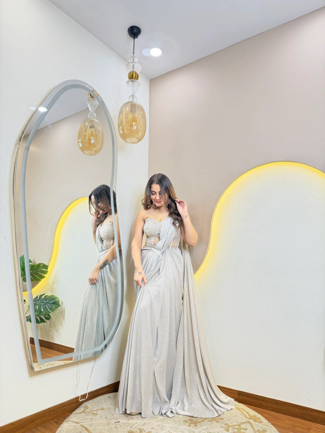 The beautifully structured bodice enhances the silhouette with its refined detailing, while the flowing drape adds a graceful and dramatic touch. The fluid fall of the fabric creates a flattering shape, combining the elegance of a saree with the ease of a gown. Crafted from high-quality material, this ensemble is soft, breathable, and lightweight — ensuring comfort while you sparkle all evening.