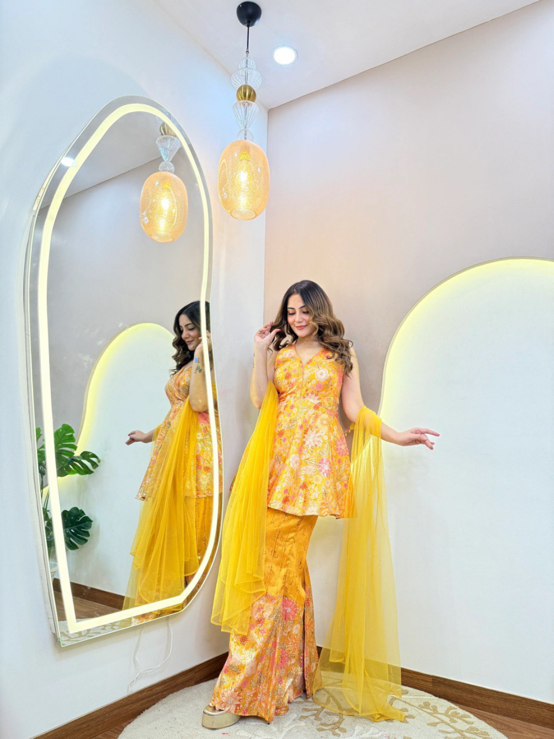 Brighten every celebration with this vibrant Sunshine Bloom Festive Sharara Set, designed to radiate joy and elegance. The beautiful blend of yellow and floral tones creates a fresh, festive look that’s perfect for daytime functions and wedding festivities.