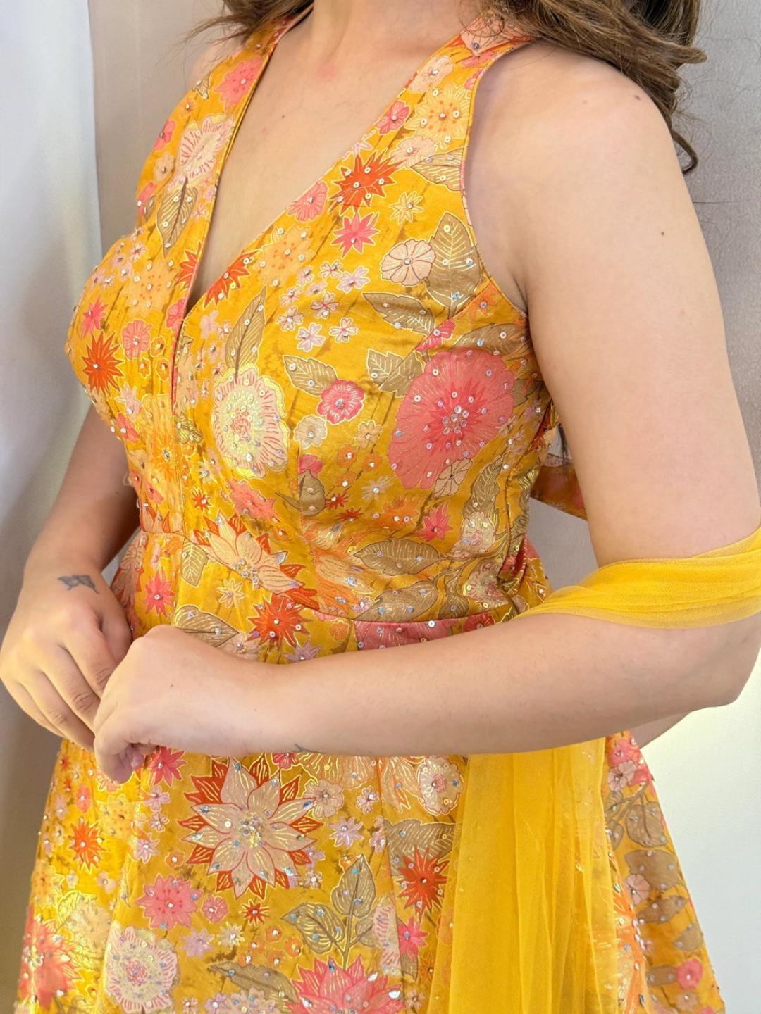 Crafted from high-quality fabric, this ensemble is soft, breathable, and comfortable — ideal for long celebrations. Whether it’s a haldi ceremony, mehendi function, or festive gathering, this outfit ensures you stand out effortlessly.