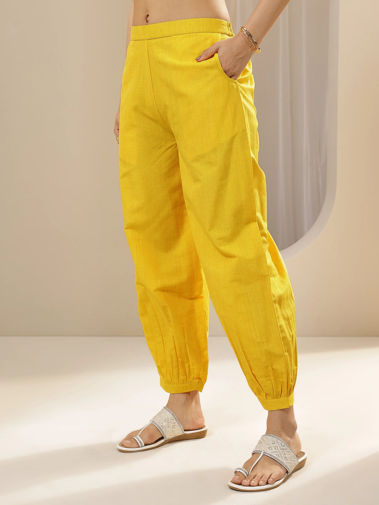 This 3-piece yellow cotton blend suit set strikes the perfect balance between comfort and understated elegance. The straight-fit kurta features a flattering V-neckline, three-quarter sleeves, and a statement yoke that adds a touch of definition to the silhouette. Paired with airy salwar pants with a partially elasticated waistband, the set ensures all-day ease and movement. Completing the ensemble is a self-design dupatta that ties the look together with refined charm. Crafted from a breathable cotton blend, this suit set is perfect for warm-weather occasions, from casual daytime outings to light festive celebrations.